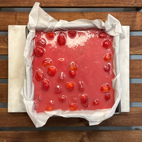 The base is exactly the same asI suggested originally: either a box mix brownie, or your favorite brownie recipe, as long as it is in an 8-in x 8-in square pan — topped with fresh strawberries. (You can find all the step-by-step details in the original post.)
