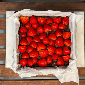 Arrange them, flat side down, on the brownies, in a way that the whole brownie pan is almost covered by strawberries.